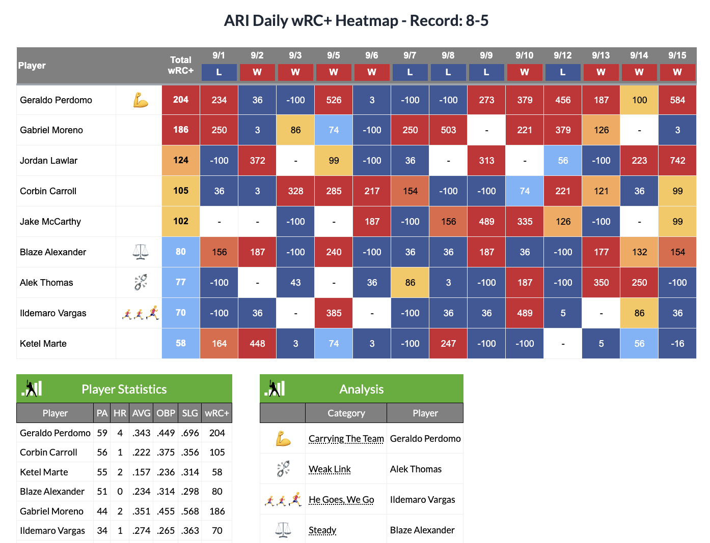 Visualize player hot and cold streaks throughout the season
